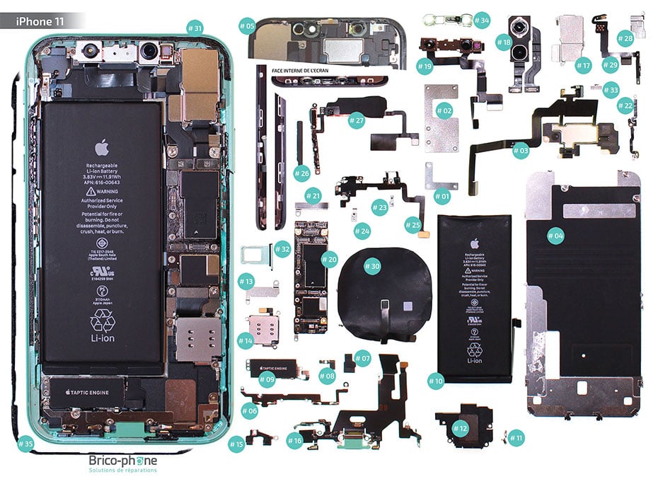 Vue éclatée des pièces détachées de l'iPhone 11
