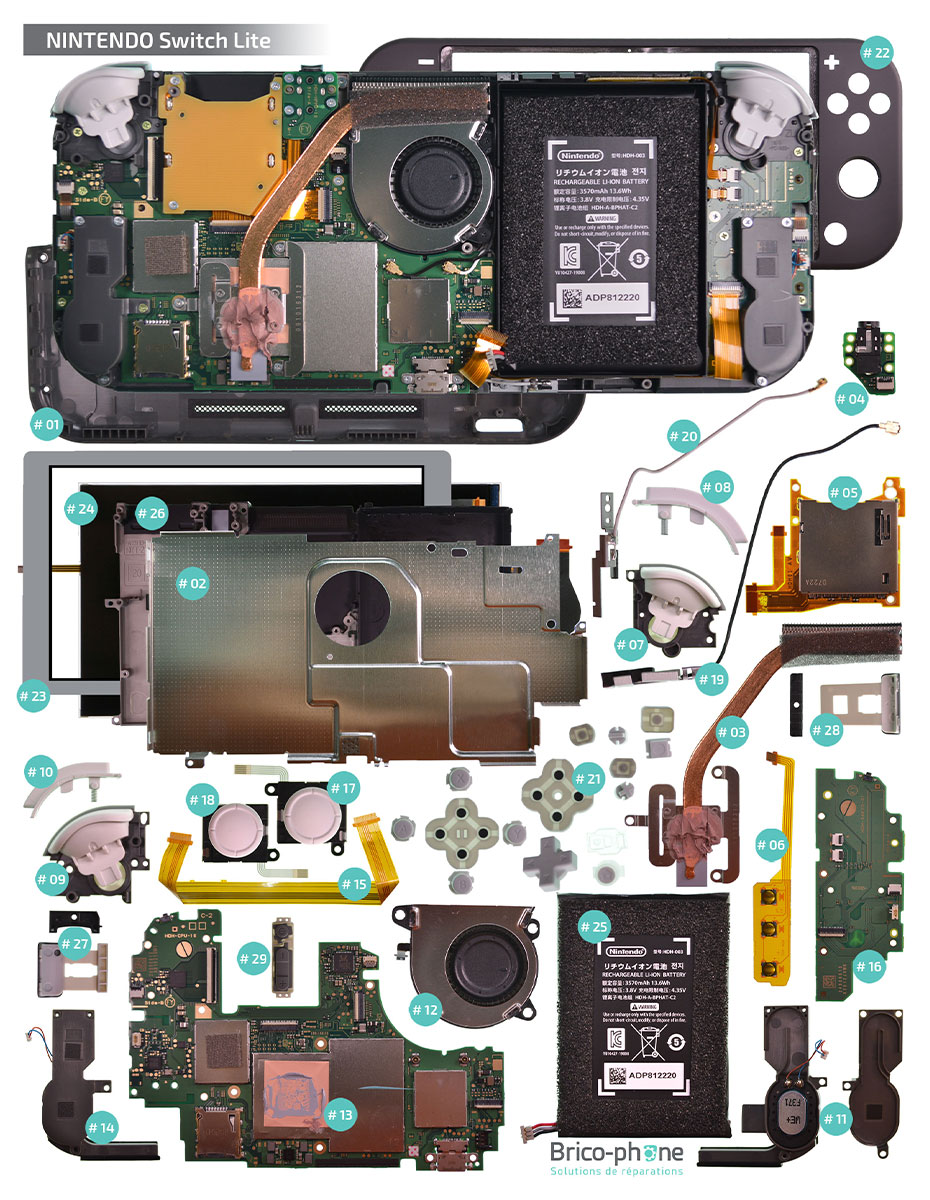 Vue éclatée des pièces détachées de la Nintendo Switch Lite